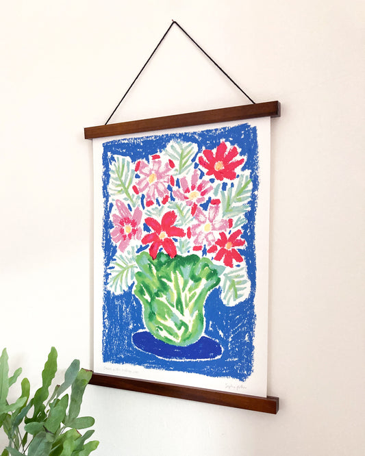 Joyful and vibrant fine art prints, and low-fi neon riso prints. Bring colour, texture and florals to your walls all year round. Prints feature nasturtiums, cosmos, tulips and sunflowers and other garden delights for your home and for gifts.